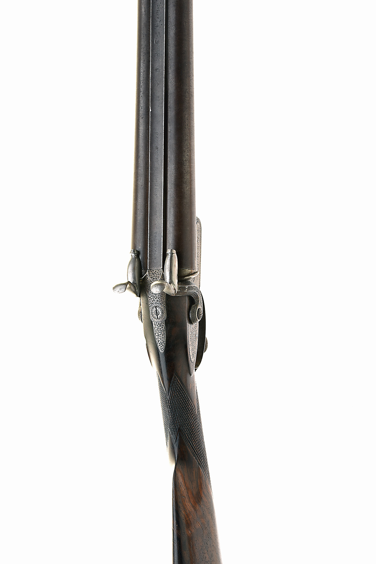 12-BORE PINFIRE DOUBLE-BARRELLED SPORTING-GUN SIGNED ALEX HENRY, serial no. 1079, circa 1864, with bold damascus 30in. barrels (signature rubbed near illegible), border and scroll engraved bar-action locks (both hammers crudely repaired), chequered walnut butt-stock and fore-end, swing under-lever opening