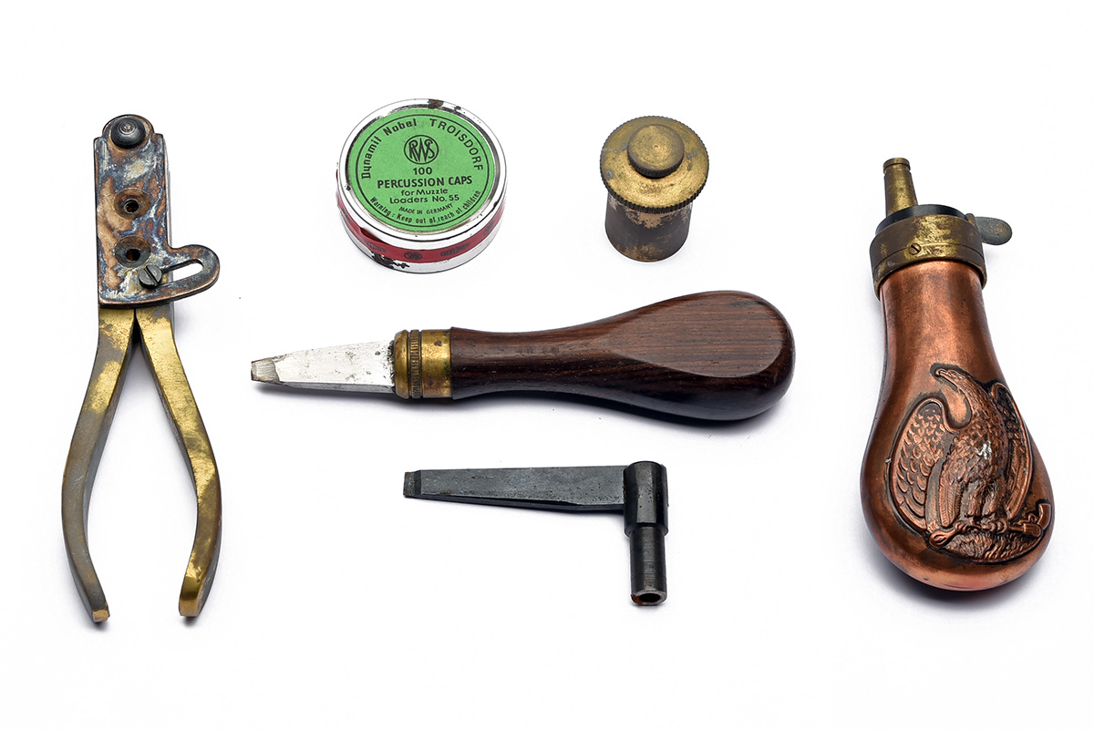 A CASED .31 PERCUSSION COLT 1849 POCKET-REVOLVER, serial no. 185327, for 1861, with 4in. octagonal signed barrel, open iron frame (cleaned), engraved five-shot cylinder, iron grip-straps, smooth walnut grip, all matching numbers except replacement wedge, in a reproduction walnut case with reproduction accessories